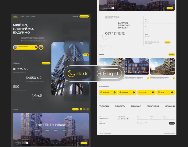 The website’s color palette was based on the company’s brand book. Our task was not only to harmoniously combine the brand colors but also to highlight the main accents and adapt the visuals for two display modes: day and night.
